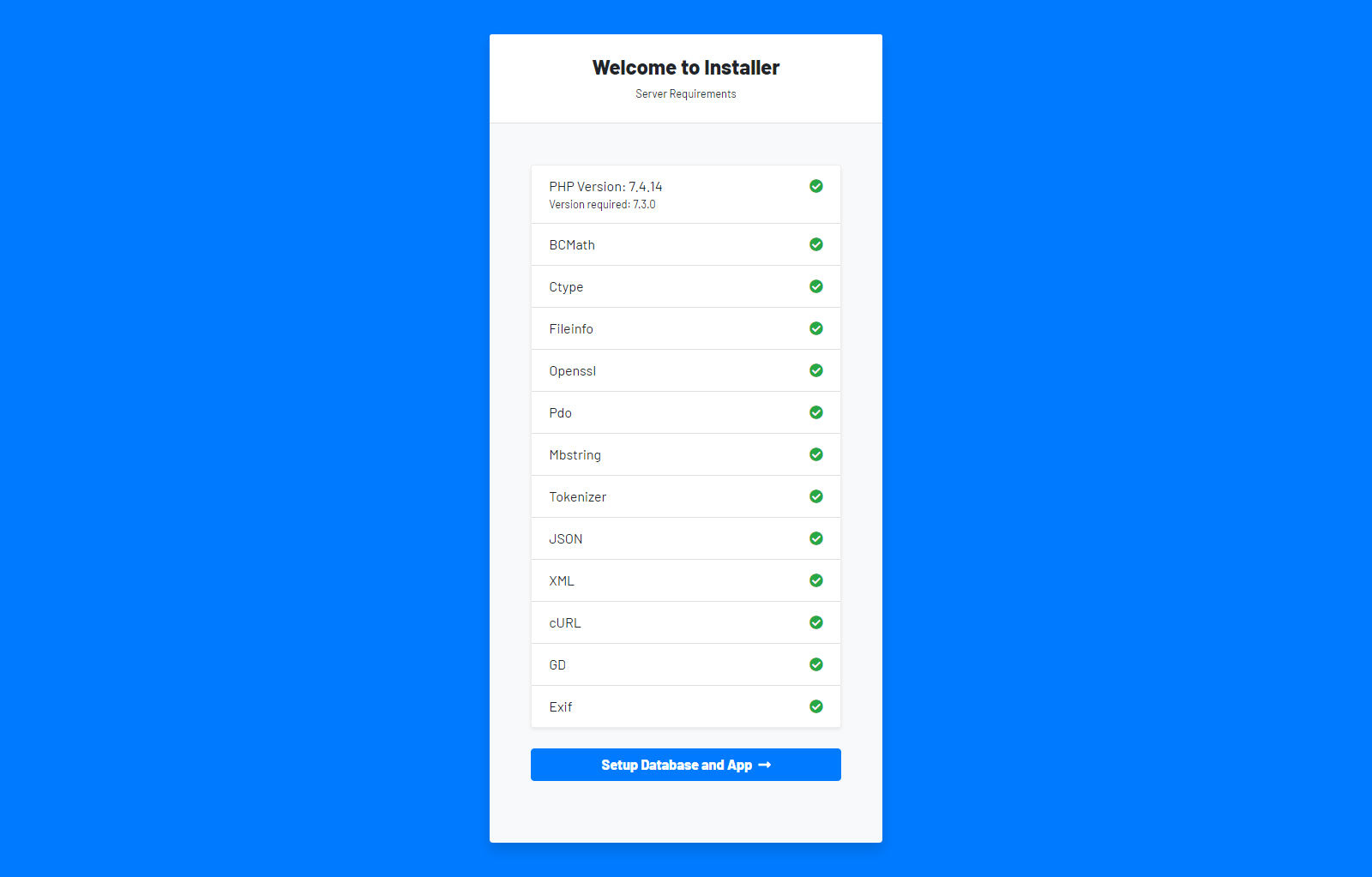 https://yousite.com/installer/script - This screen will appear, all the boxes must be green to proceed with the installation.