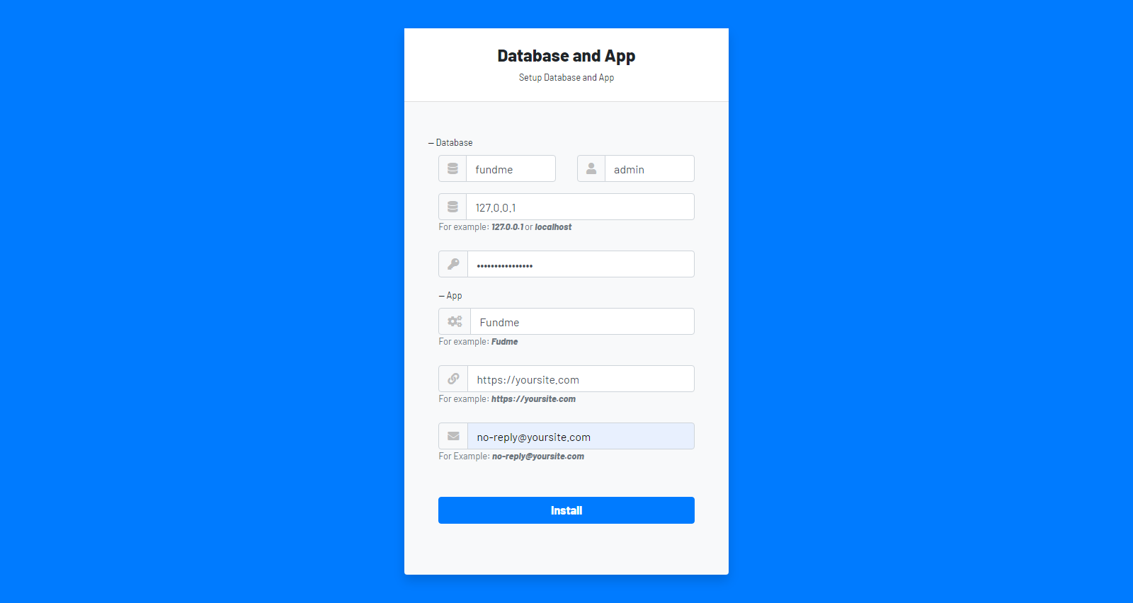 - Next, you can put the credentials of your database, your App name, URL and an email.