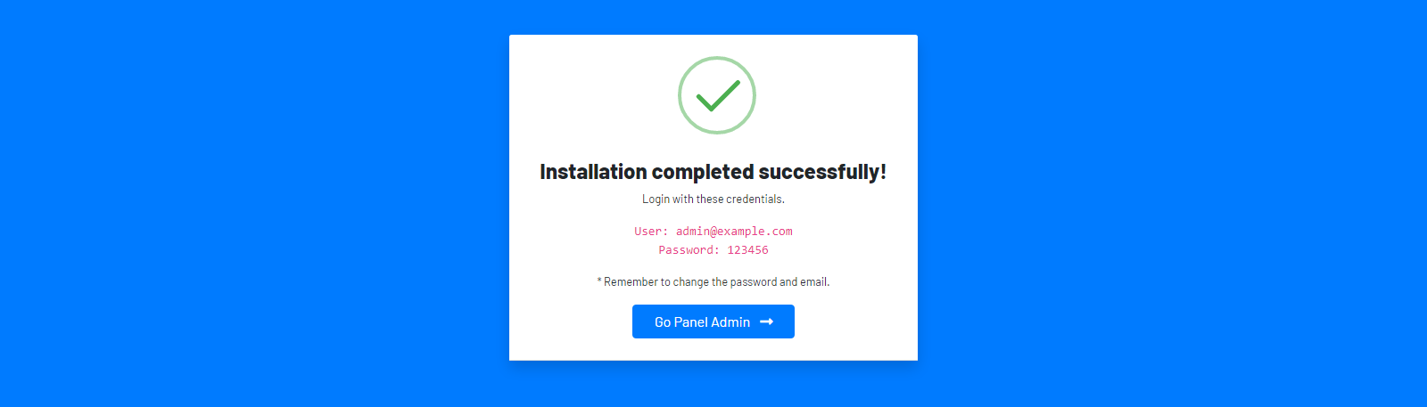 - If all goes well, a success notice will appear with the Admin credentials, remember to change immediately, click Go to Panel Admin.